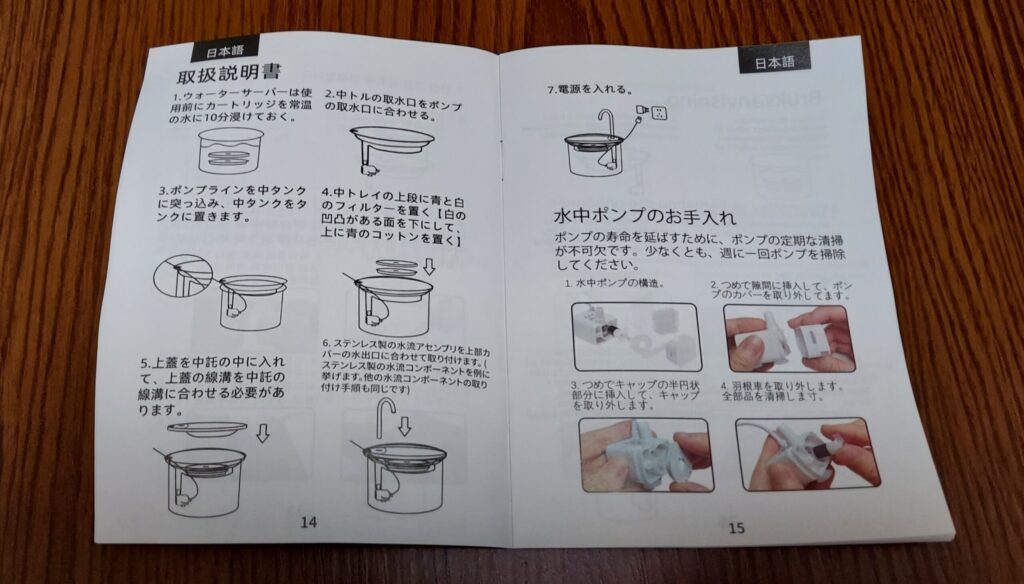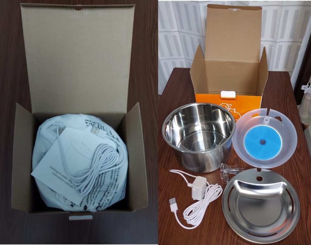 箱を開けると…ステンレス製の本体、フィルター、USB電源ケーブル、ポンプがきちんとセットになっていました👍